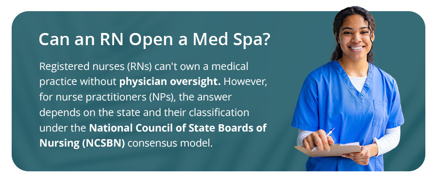 Registered nurses (RNs) can’t own a medical practice without physician oversight. However, for nurse practitioners (NPs), the answer depends on the state and their classification under the National Council of State Boards of Nursing (NCSBN) consensus model: