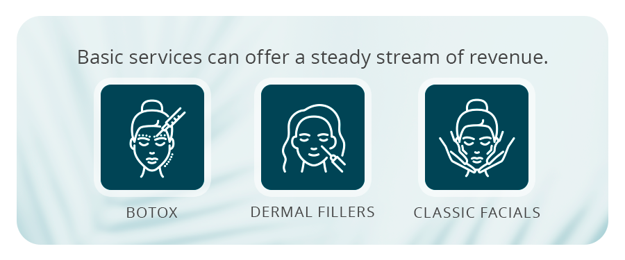 The ideal med spa menu includes staple services that clients expect and more specialized treatments. Basic services can offer a steady stream of revenue. Some examples include: