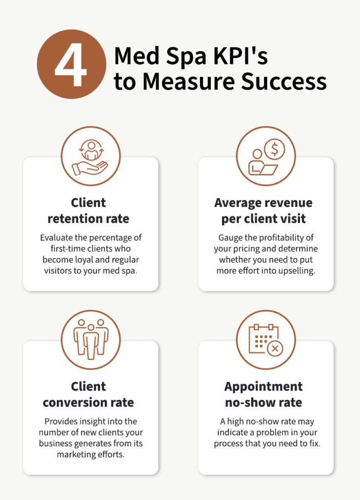 - Client retention rate: Evaluate the percentage of first-time clients who become loyal and regular visitors to your med spa.