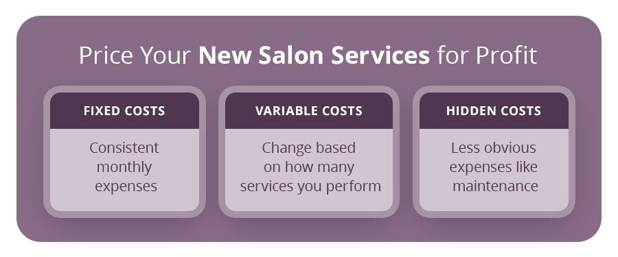 • Variable costs: These change based on how many services you perform — product usage, supplies, and commissions.
