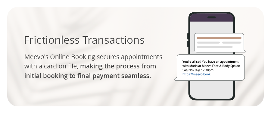 Beyond beauty trends, convenience often drives booking decisions. Clients expect a seamless experience from booking to payment. Easy online booking and simple account management let clients conveniently update their information from their smartphones. Any friction in this process can seem outdated, which is why you need the right platform to simplify this entire journey for your clients. Meevo’s Online Booking secures appointments with a card on file, making the process from initial booking to final payment seamless.