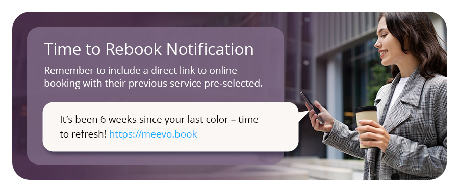 Automatically remind clients when it’s time for their next appointment, based on their service history. For example, “It’s been 6 weeks since your last color—time to refresh!” Remember to include a direct link to online booking with their previous service pre-selected.