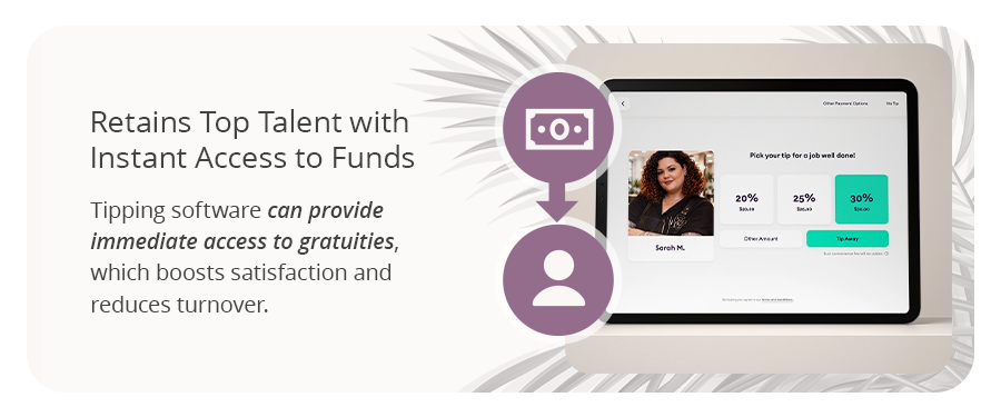Tipping software can provide immediate access to gratuities, which boosts satisfaction and reduces turnover. When your team knows their efforts are instantly rewarded and accessible, it promotes loyalty and increases motivation.
